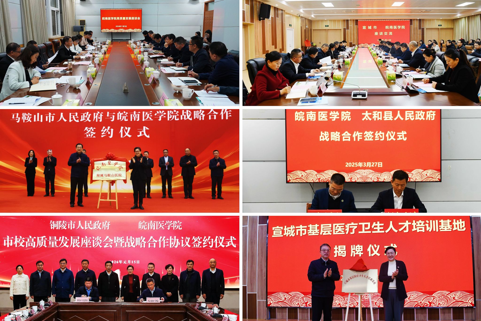 校地合作走向深入,破解发展关键瓶颈。先后与芜湖市、宣城市、马鞍山市、太和县、铜陵市签署战略合作协议,推进校地资源共享、优势互补。芜湖市全力支持学校更名大学及博士学位授予单位立项建设,帮助学校历史性地解决了长期制约发展的办学空间不足难题;每年还投入专项经费,与学校共建脑科学研究院等创新平台。学校与宣城市共建宣木瓜传承与创新研究院等平台,成为宣城市基层医疗卫生人才培训基地;与马鞍山市联合打造“公共卫生卓越医师班”;与铜陵共建省级专科区域医疗中心。