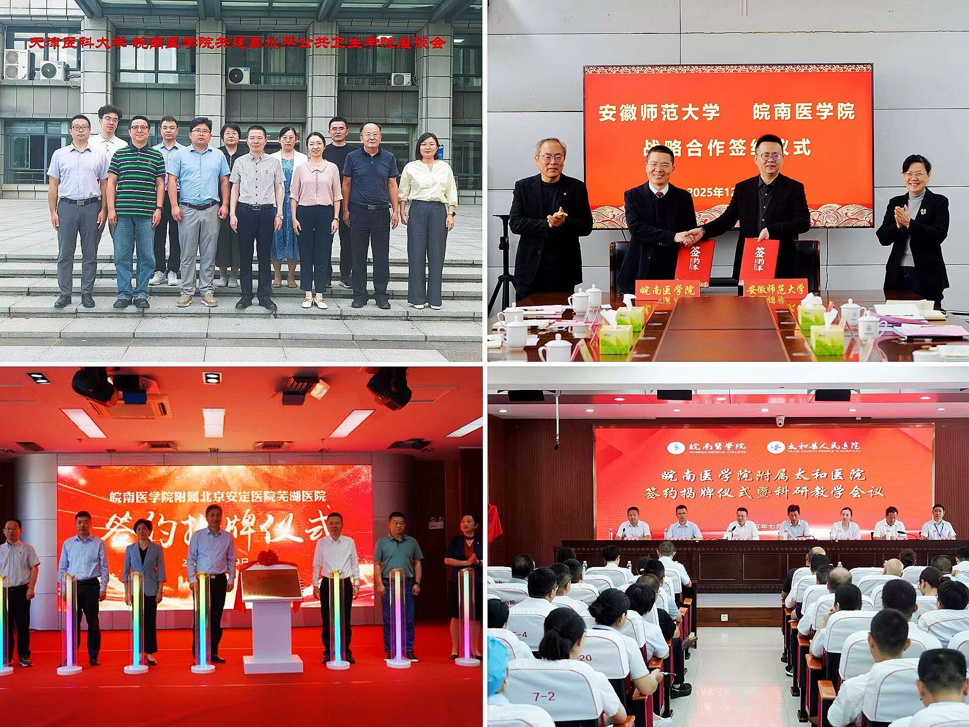 校际校院教研联动,完善协同发展体系。积极推进校际医教研联动,完善协同发展体系。与安徽师范大学签署战略合作协议,在人才联合培养、学科交叉融合、科研平台共享等方面全面合作,促进学科交叉融合。与天津医科大学签订高水平公共卫生学院共建合作协议,联合承办海河公共卫生高质量发展论坛。新增5所非直属附属医院,为学校学科建设与人才培养提供了更坚实的临床支撑。